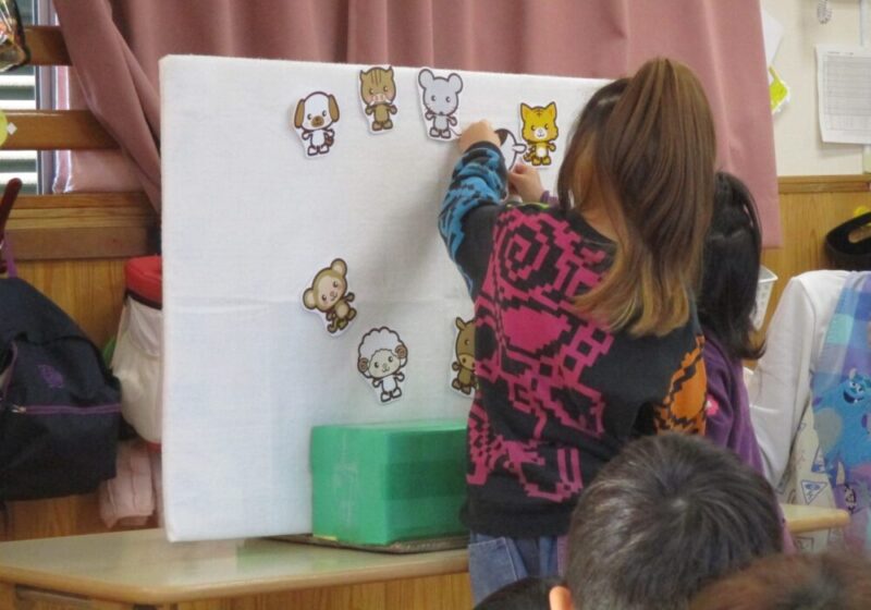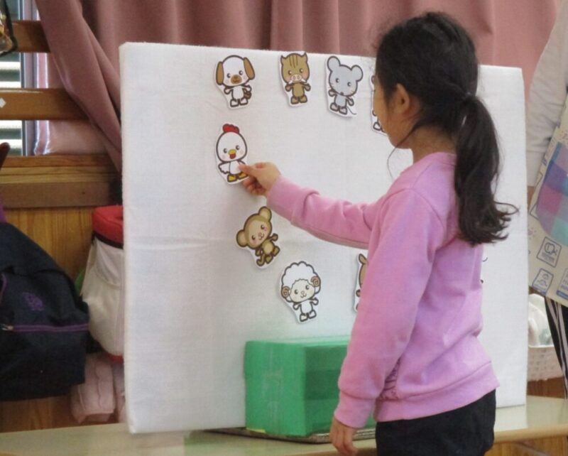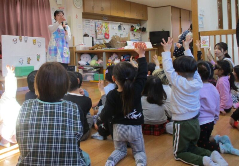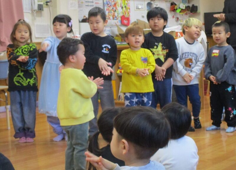 今年の干支「午」についてのお話を聞いたり、皆で干支の穴埋めクイズを楽しみました。「ここに入る干支が分かる人いるかな~?」と聞くと「はーい!」と元気な声がたくさん聞かれましたよ♪答えが中々出ない時は、先生達にそれぞれの干支のモノマネをしてもらいました!「モーモー」「コケコッコー!」など、先生達も会を盛り上げてくれました!