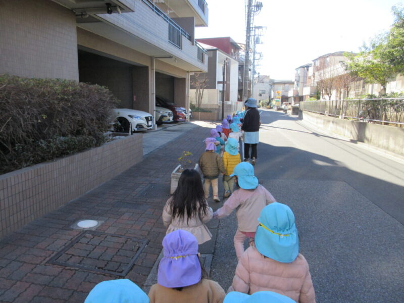 ゆり組になると、お散歩ロープではなくお友だちと手を繋いで散歩に行きます。