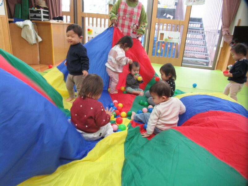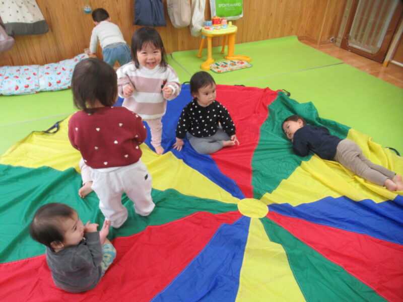 パラバルーン遊びも大好きです!ごろ~んと寝転がってみたり、ボールを転がして楽しんでいますよ♪