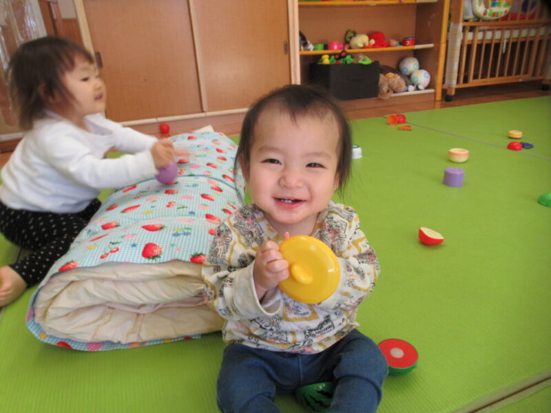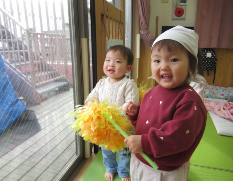 ポンポンを使っての「おそうじごっこ」も最近のお気に入りです!「ここも」「こっちも!」と様々な所をきれいにしてくれています。「お掃除は私達にお任せあれ☆」