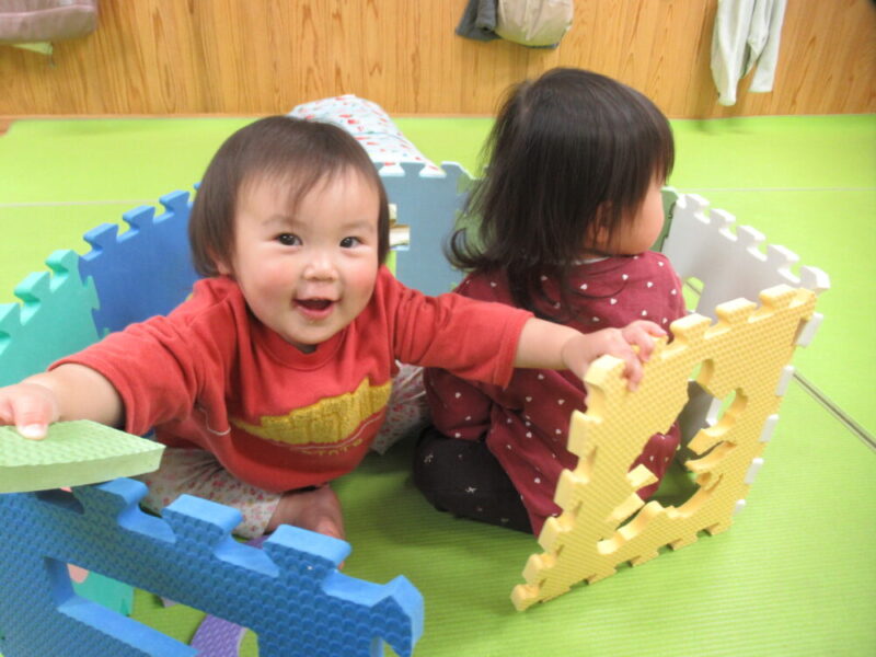 クッションパズルで作ったお風呂に入って「あったかーい!」と言ったり、お椅子を作って「ここで待っててね」と遊びを通して楽しんでいたあひる組さんでした♪
