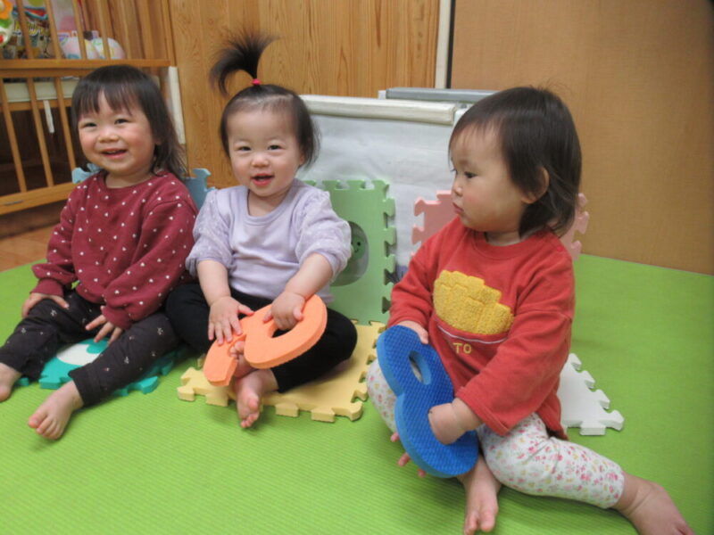 クッションパズルで作ったお風呂に入って「あったかーい!」と言ったり、お椅子を作って「ここで待っててね」と遊びを通して楽しんでいたあひる組さんでした♪