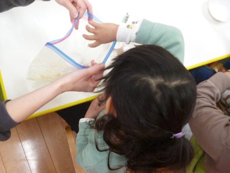 まずは、バナナを袋に入れてつぶしてもらいます!