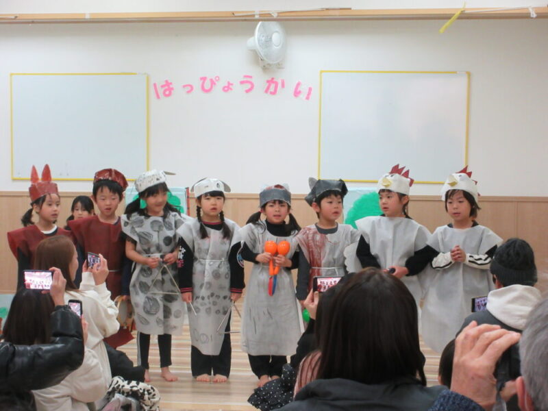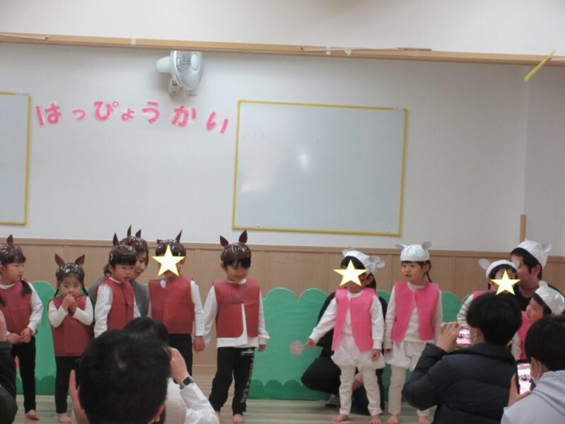 日々の活動から好きな絵本やごっこ遊びなどで題材を決め、子どもたち一人一人可愛い衣装を着て楽しく発表会ができました!!