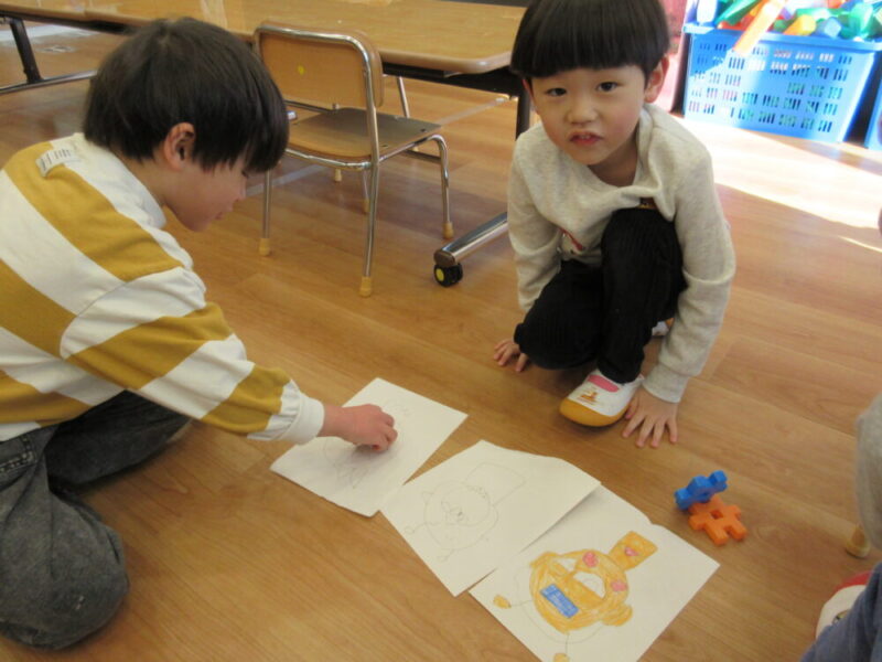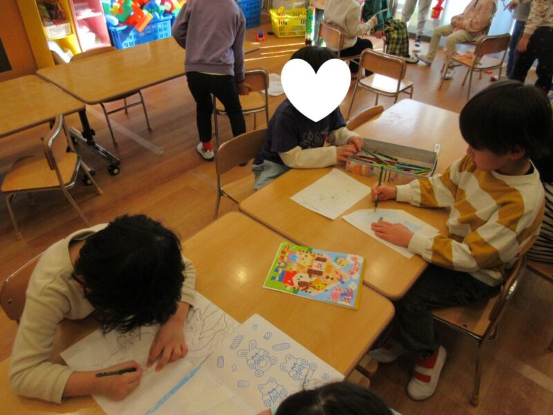 お絵描きやぬりえがうまくできるとお互いに見せ合いっこが始まりました😊