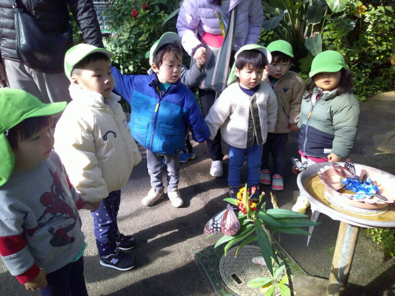 生物園では広い温室に沢山のちょうちょが!普段見ないような色や大きさのちょうちょにうっとりする子と、少し怖がる子がいました。