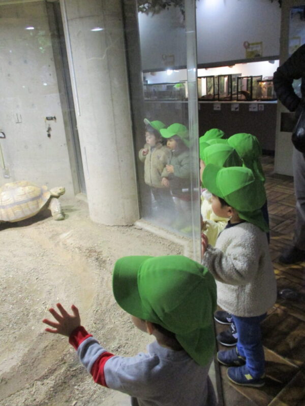 なかなか乗る機会のない園バスでハイテンションな子ども達。たくさんお話をしながら、『足立区生物園』に行ってきました♪