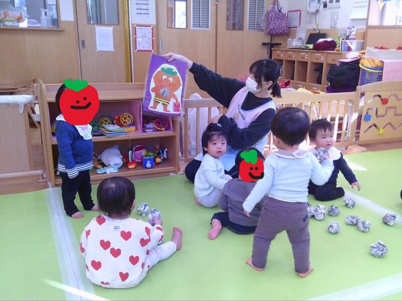 鬼が来たらどうしよう!?やっつける豆を作っとこう!と、ぶどう組・めろん組のみんなで新聞紙を丸めて作ってもらいました!