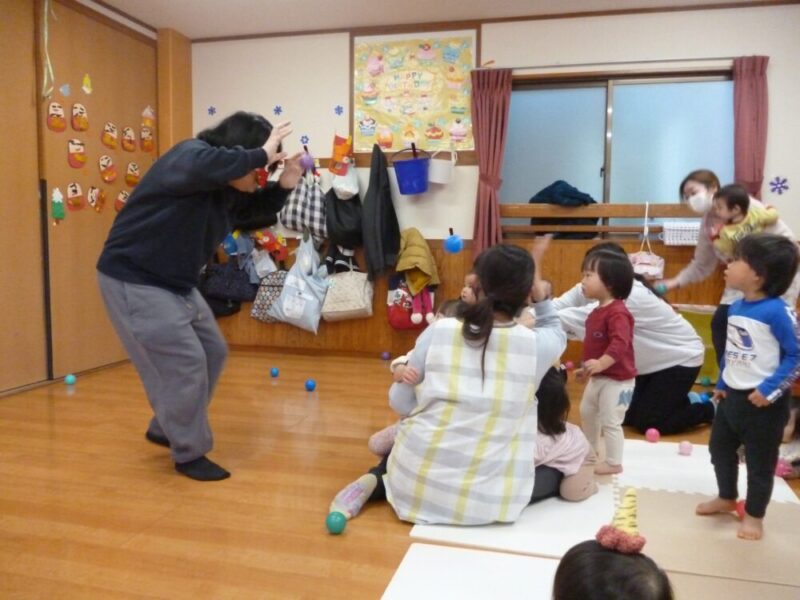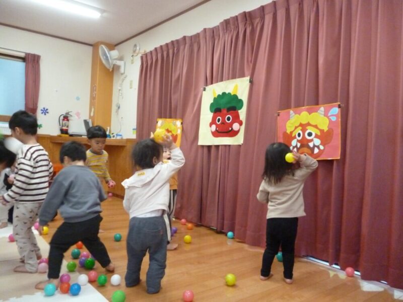 みんなで「豆まき」の歌を歌った後は、怒りんぼ鬼、泣き虫鬼など、みんなの心の中にいる色々な鬼のイラストに向かって豆まき風的当てをしました🥎