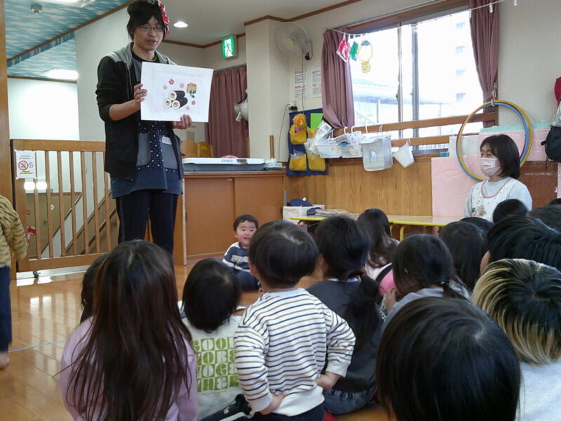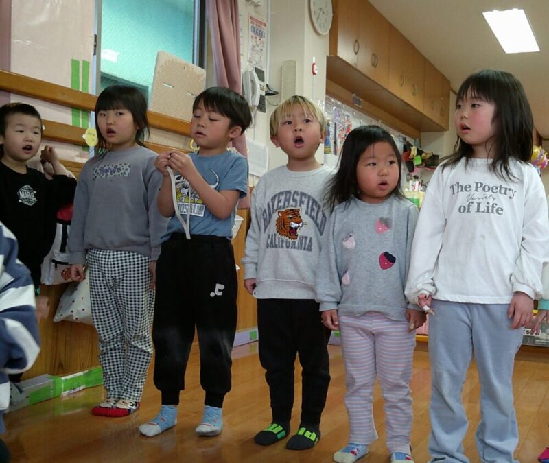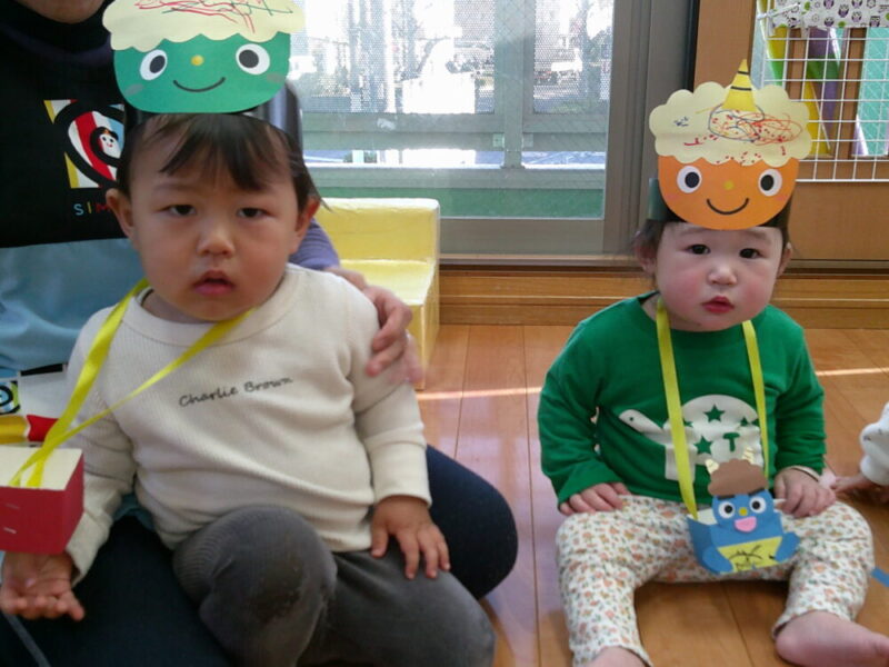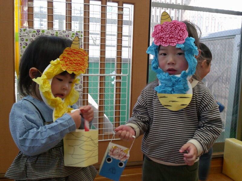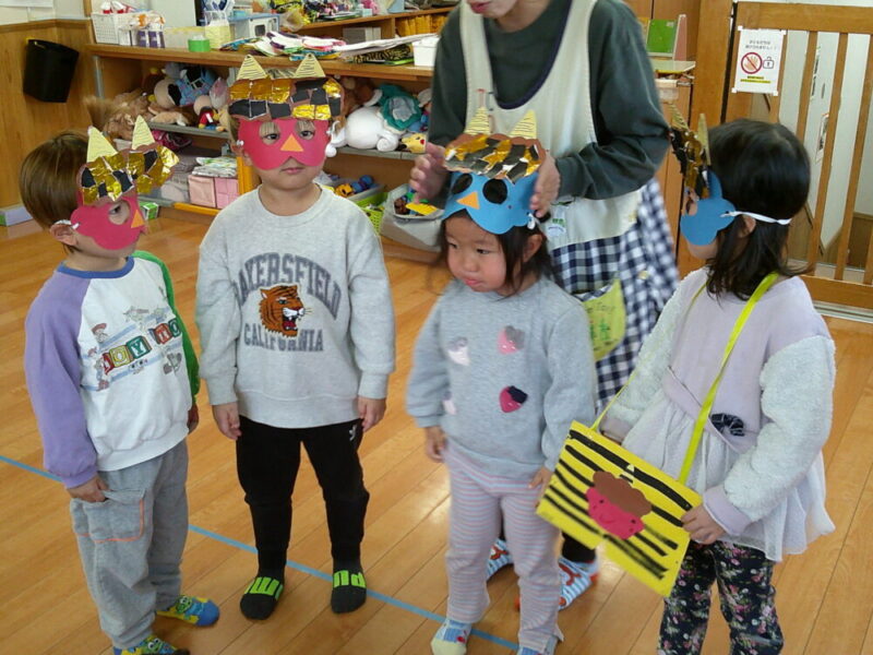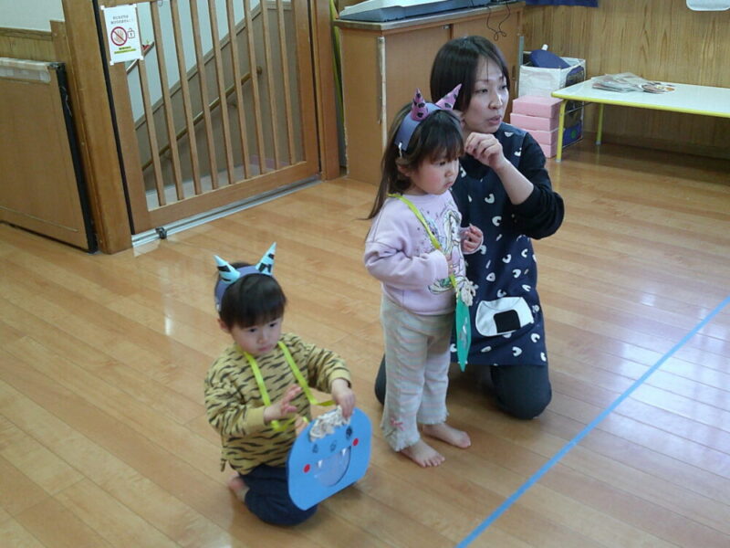 2月3日節分集会を行いました。節分の話しで怖い鬼が登場すると子ども達は口々に「こわ~い」と言いつつも楽しんで聞いていました。「まめまき」の歌もみんなで楽しく歌えました♪製作はどのクラスもとても上手に作れていましたよ。