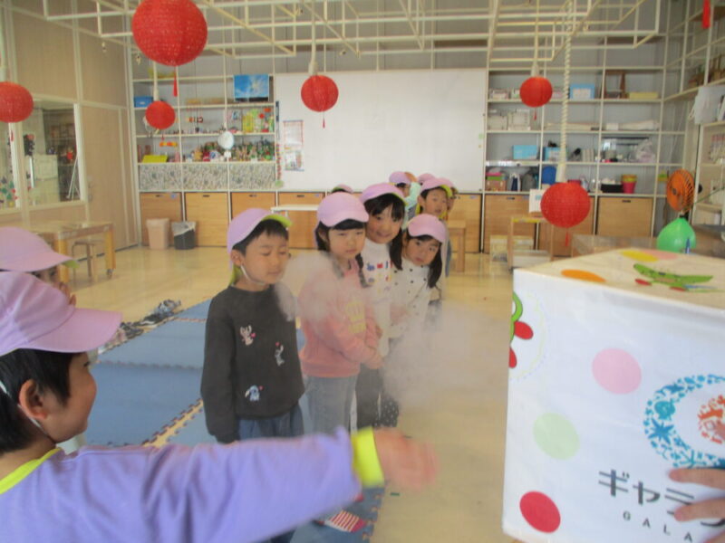 煙で空気を見えるようにするとドーナツ形に見えて大興奮になりながら「あまいにおい!」と煙の匂いも楽しんでいました!
