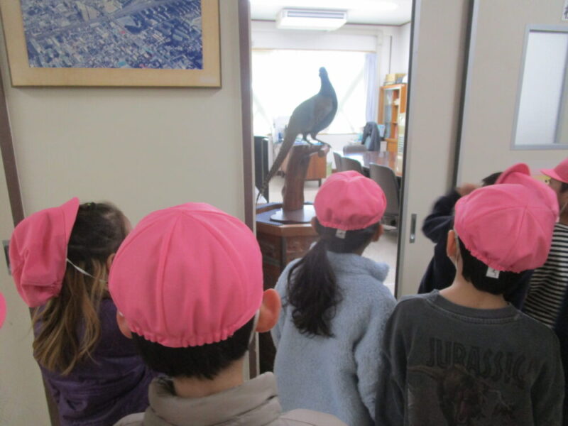 特別に校長先生のお部屋の見せてもらいました!キジの剝製にびっくりしていた子どもたちです(笑)