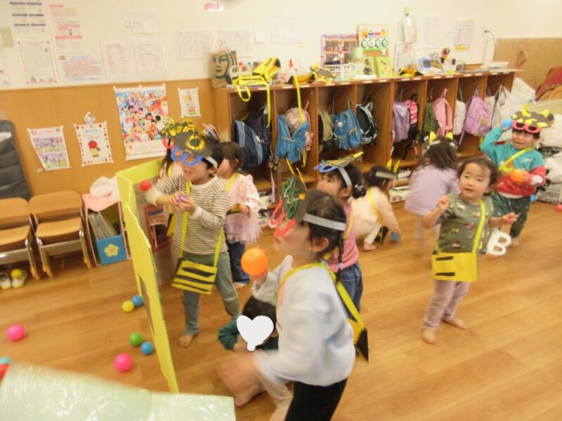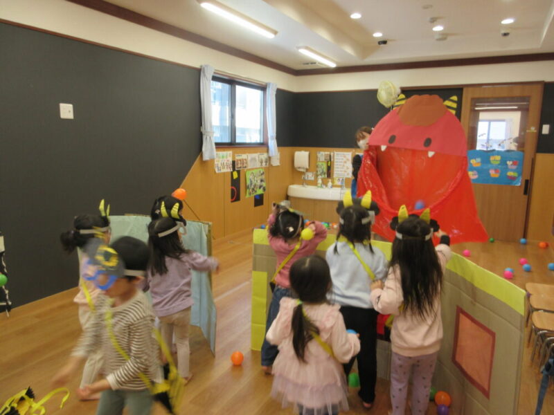 節分集会の後に、お部屋の中で鬼退治(ボール投げ)をして遊びました👹自分で作った鬼のお面やカバンを身に付けて、鬼をやっつけるぞ~!と張り切っている姿が見られました!!