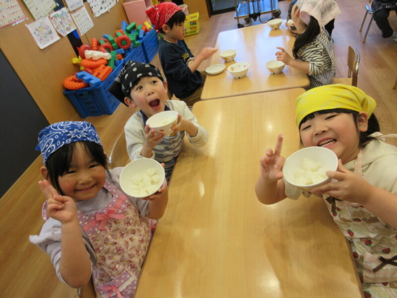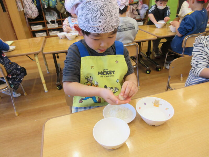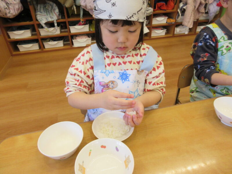 手に水を付けてごはんが手につかないようにするのに苦戦しながらも楽しそうに丸めていましたよ!