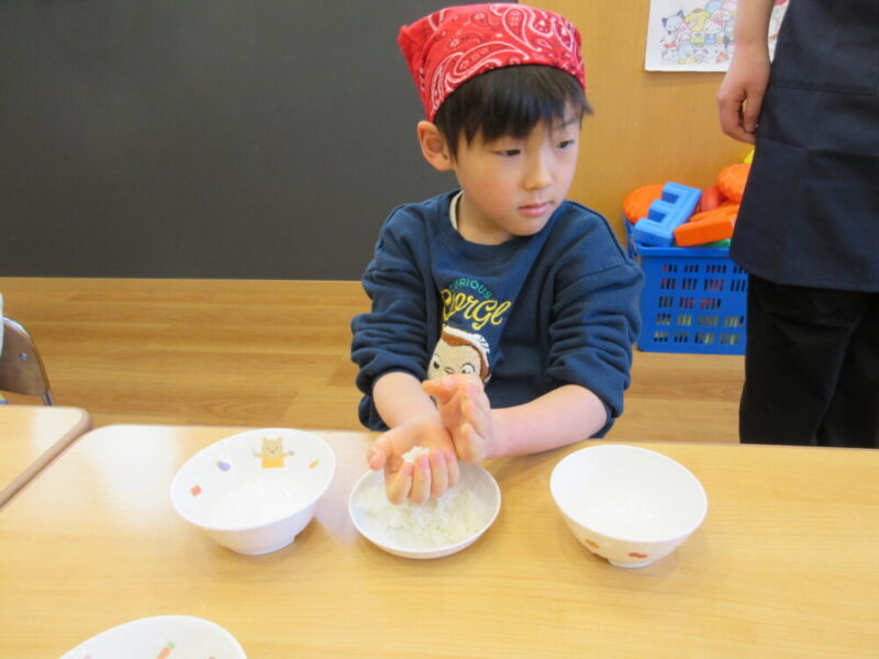 手に水を付けてごはんが手につかないようにするのに苦戦しながらも楽しそうに丸めていましたよ!