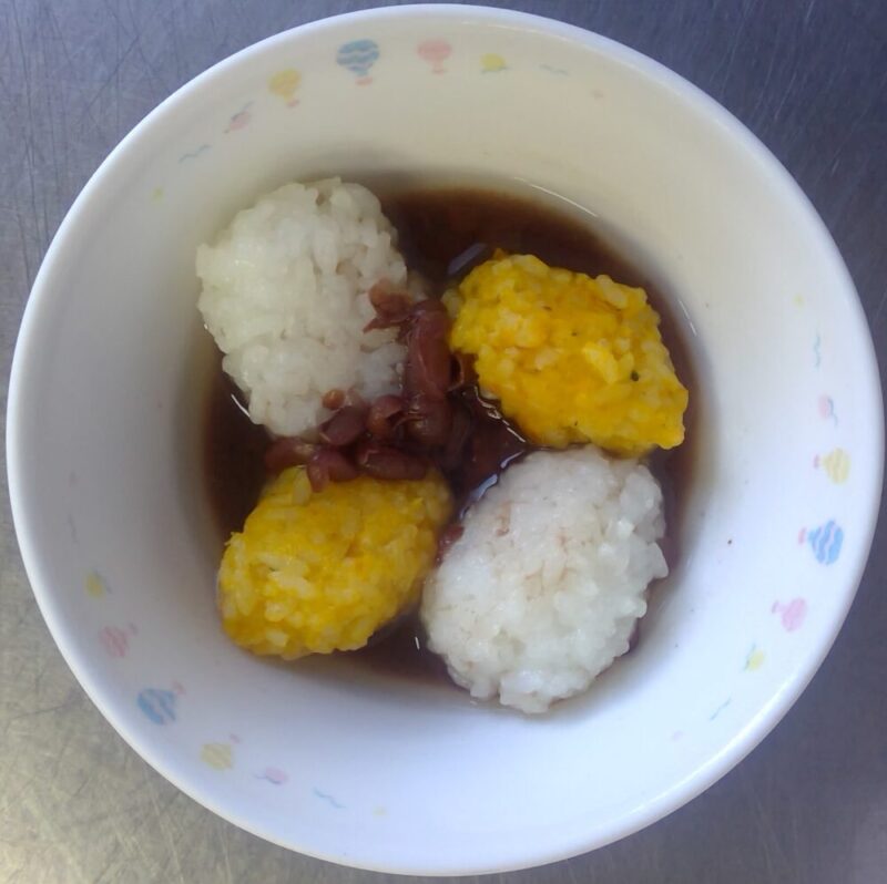 さばの煮食いは浜田市の伝統的な漁師料理です。しょうゆで味付けをした濃い目のだしでさばをすき焼き風にして食べます。 給食はたくさんの具材やさばのうまみも入り、おいしく仕上がりました! おやつのぜんざい風は柔らかく炊いたお米をつぶして丸め、お餅に見立てて作りました。黄色い方にはかぼちゃが練りこまれていますよ。 「黄色いのはなにかな?」と楽しそうに話しながら食べる姿が見られました。