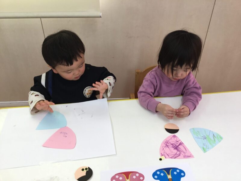 目は黒いシールを貼りました。小さく切ったシールの台紙から、更に小さなシールを剥がすのには少し苦戦していましたが、少し折れてしまった部分も、顔に貼ってみると、ウィンクしているように見えます。口は赤いクレヨンで描いてみました。保育者が「お口をかいてみて」とクレヨンを渡すと、「にこ~」と言いながら、優しいタッチで丁寧に口を描くことができました。