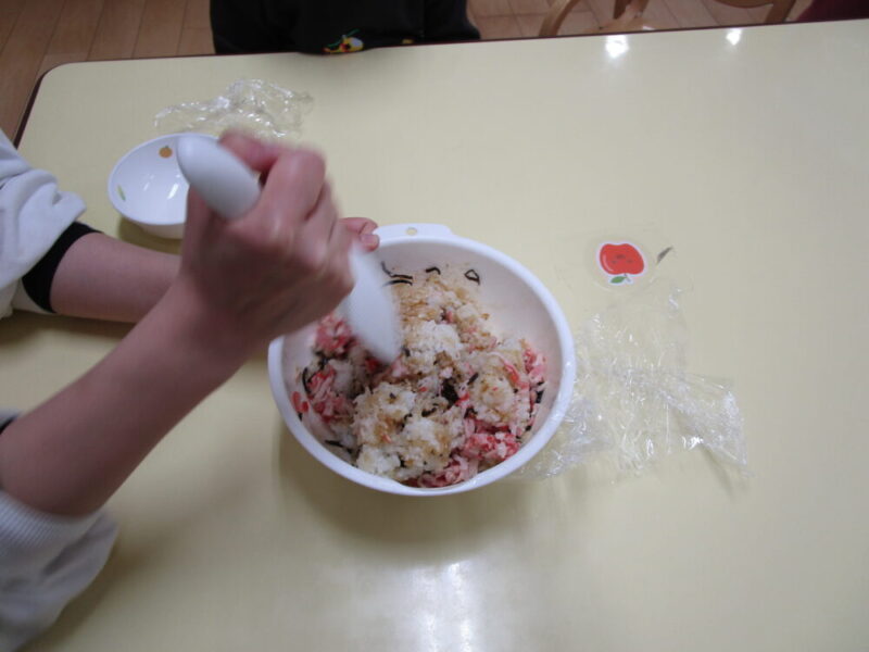 午前中カニカマをみんなで割いた後、午後に栄養士が持ってきてくれたご飯に材料を混ぜてみんなでにぎにぎ。