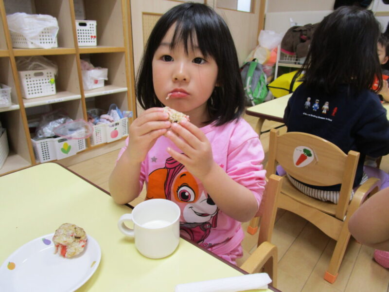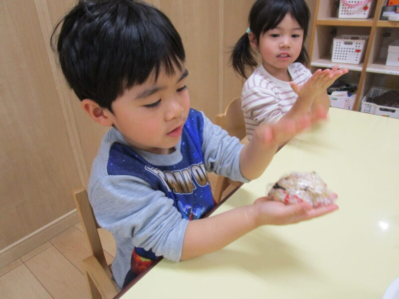 自分でにぎにぎしたおにぎりは格別に美味しいね!とても大きな丸いおにぎりが作れました。三角にしたりハートを作ったりみんな好きな形に作っていました。