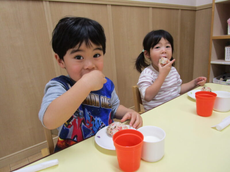 自分でにぎにぎしたおにぎりは格別に美味しいね!とても大きな丸いおにぎりが作れました。三角にしたりハートを作ったりみんな好きな形に作っていました。