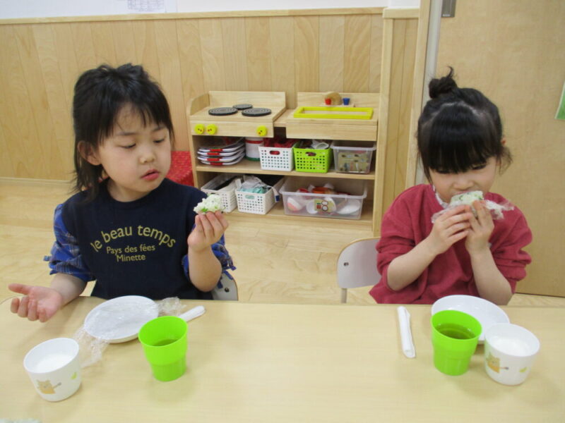「にぎるのちょっとたいへんだった」「でもたのしかった!」と言いながら大きな口で食べていました。