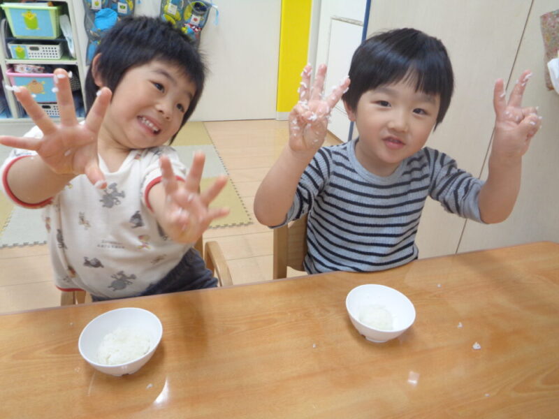 早速おにぎり作りスタートです!お茶碗にはいった、ごはんをにぎにぎ…🍚