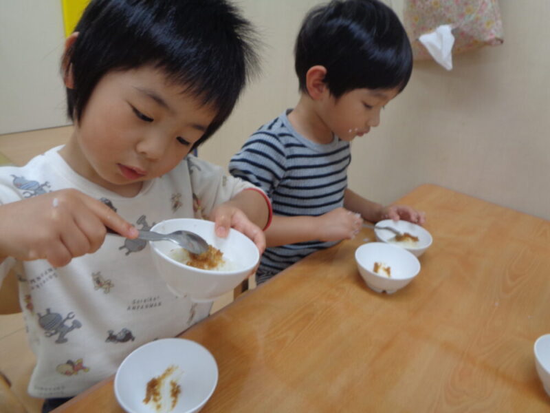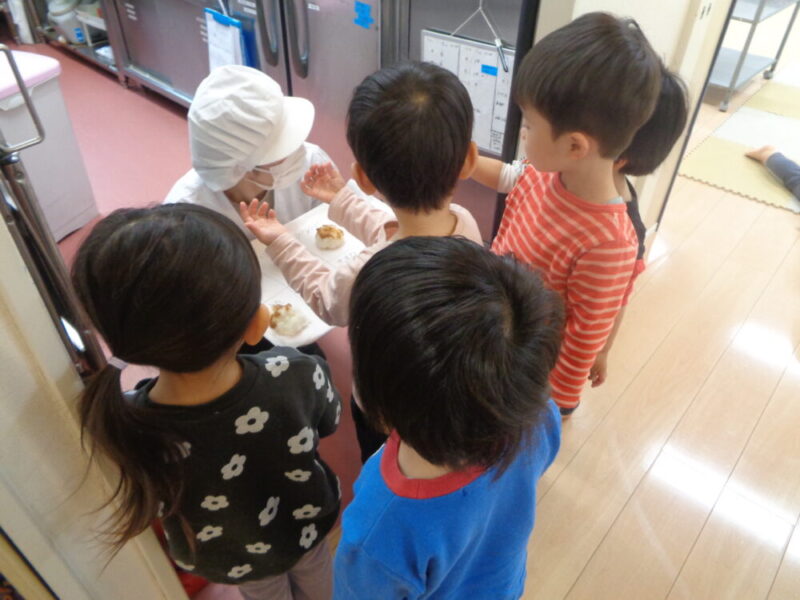 みんなで調理室に行き、調理さんへバトンタッチ!「おねがいしまーす!」と大きな声で仕上げをお願いをしました。