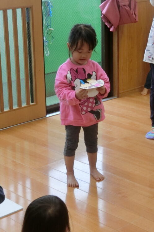 まずは2階のお部屋に全クラスが集まり、みんなが作ったひなまつりの製作を紹介しました。