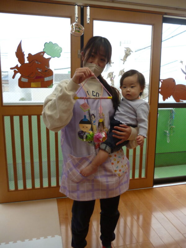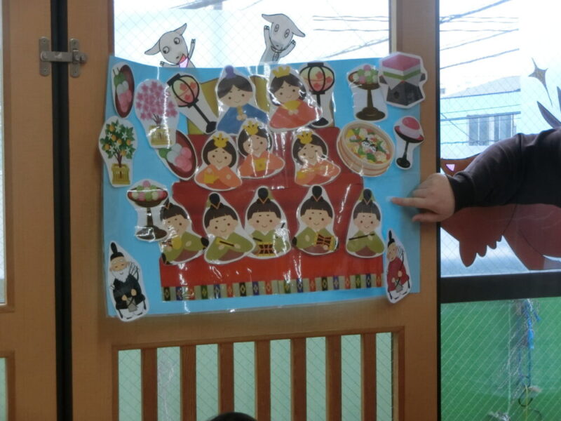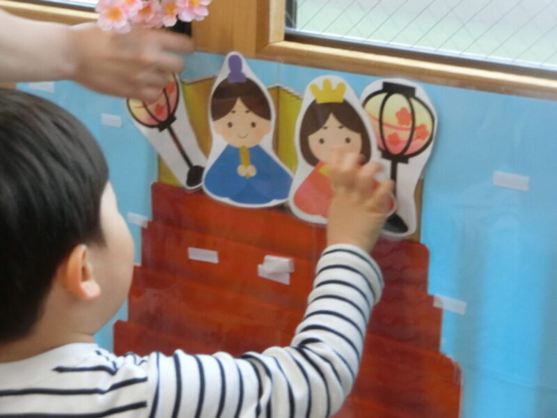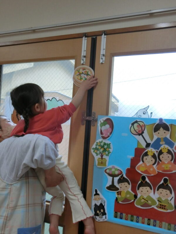 カーテンの裏やおもちゃの棚の中など、いろいろなところに隠れていましたが、みんなすぐに見つけて上手に飾り付けてくれました🎎✨