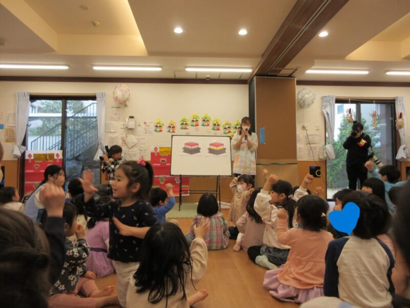 ひな祭りのクイズを出すと正解だと思う方に「はーい!」と元気よく手を挙げて答えてくれました。