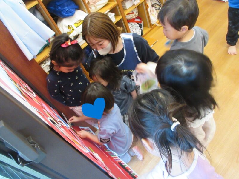 4,5歳児クラスの子どもたちはゲームの前に見本のひな飾りを見て配置を覚えて貼りに行くという少し難しいルールで挑戦しました!