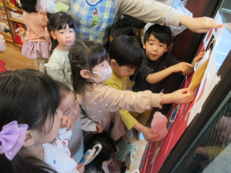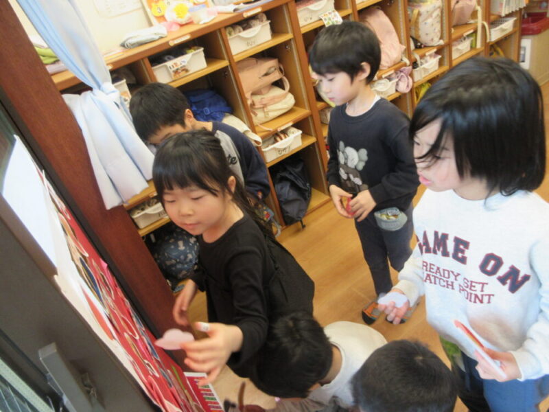 降園時に「これ作ったんだー!」と保護者の方に見せたり、他のクラスのひな飾りを見て「かわいいね」と感想を話したりする姿も見られました!