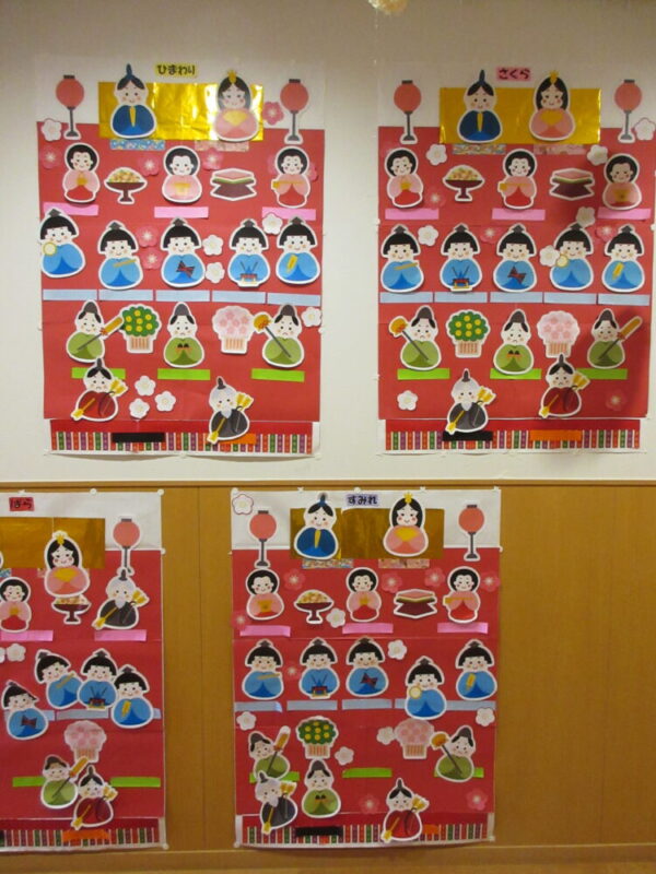 絵あわせゲームで完成させたひな飾りは廊下に並べて展示しました!