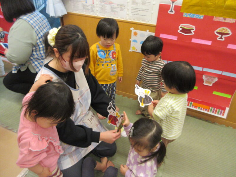 ひな祭りのクイズを出すと正解だと思う方に「はーい!」と元気よく手を挙げて答えてくれました。