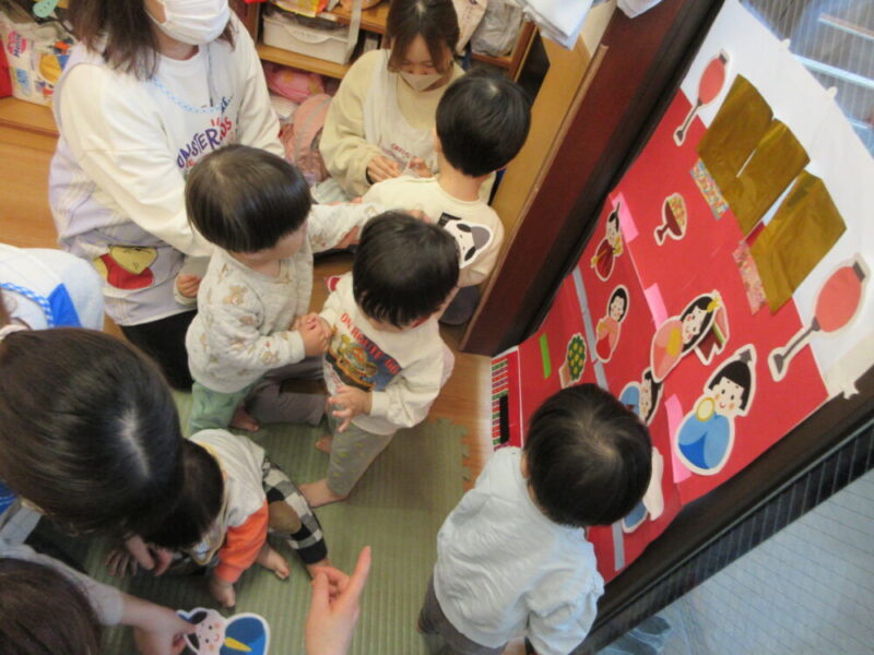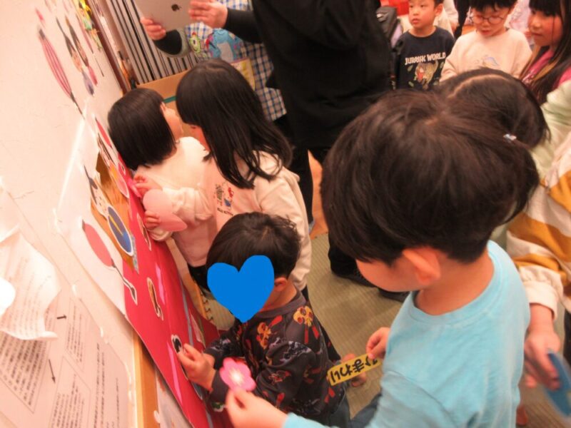 4,5歳児クラスの子どもたちはゲームの前に見本のひな飾りを見て配置を覚えて貼りに行くという少し難しいルールで挑戦しました!