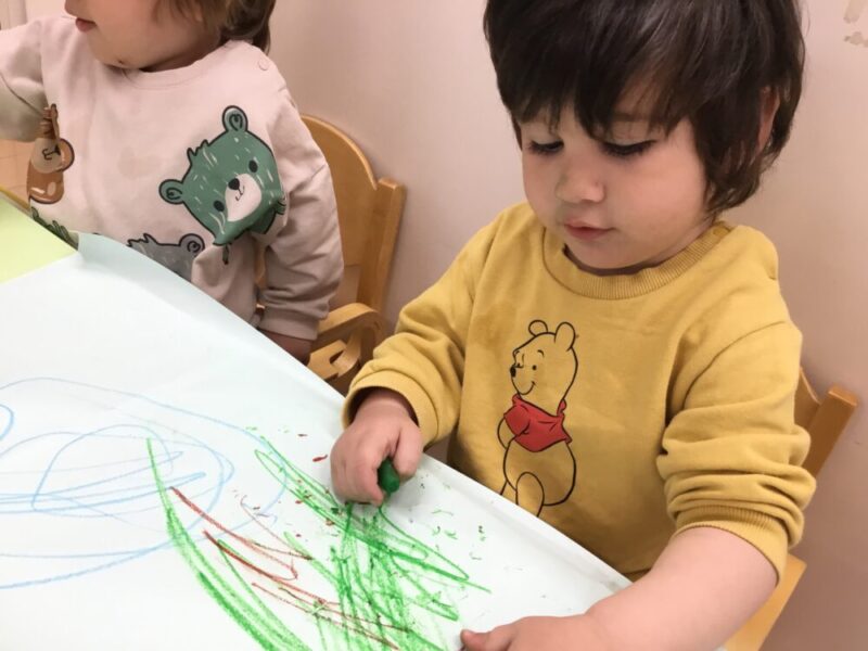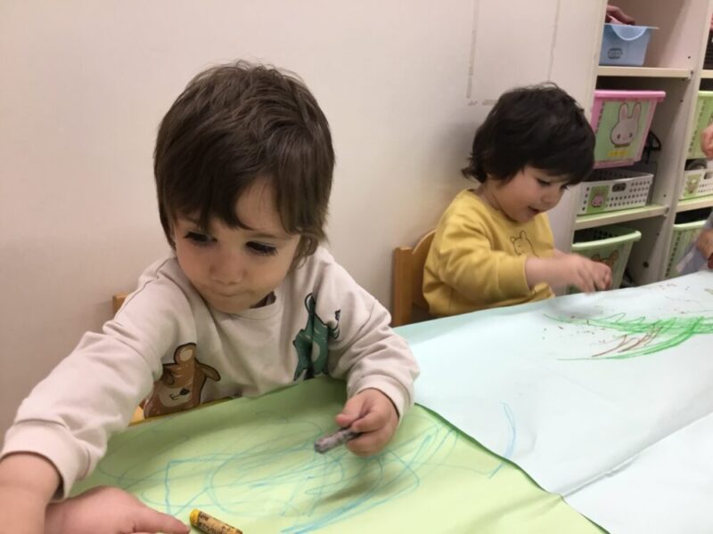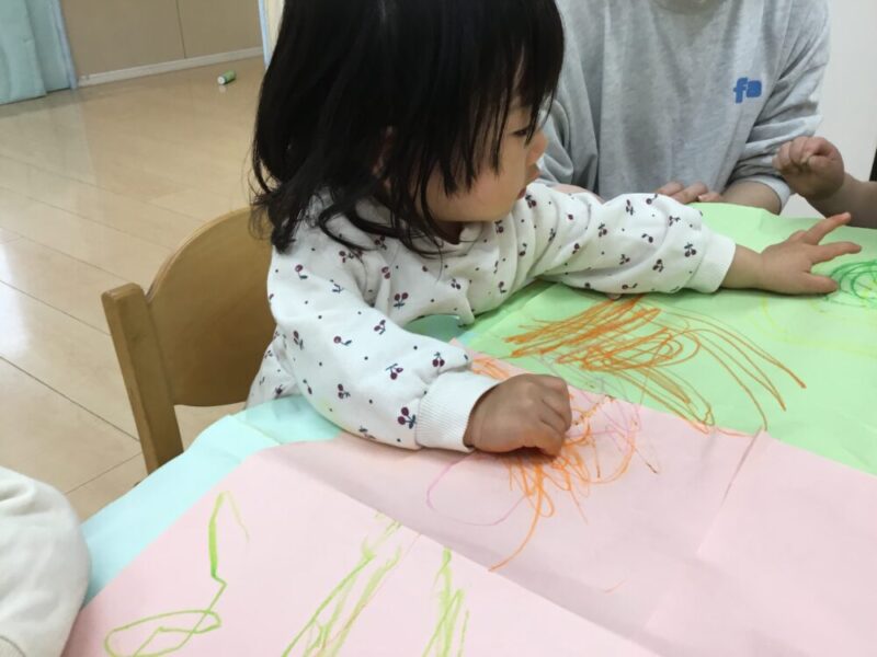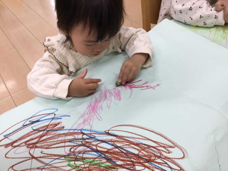 以前はクレヨンをトントンして、点々で色を付けることが多かった子も、今回はしっかりなぐり書き出来ていたり、長い線を描いていたりと、お絵描きの仕方でも成長が見えて感動しました!✨