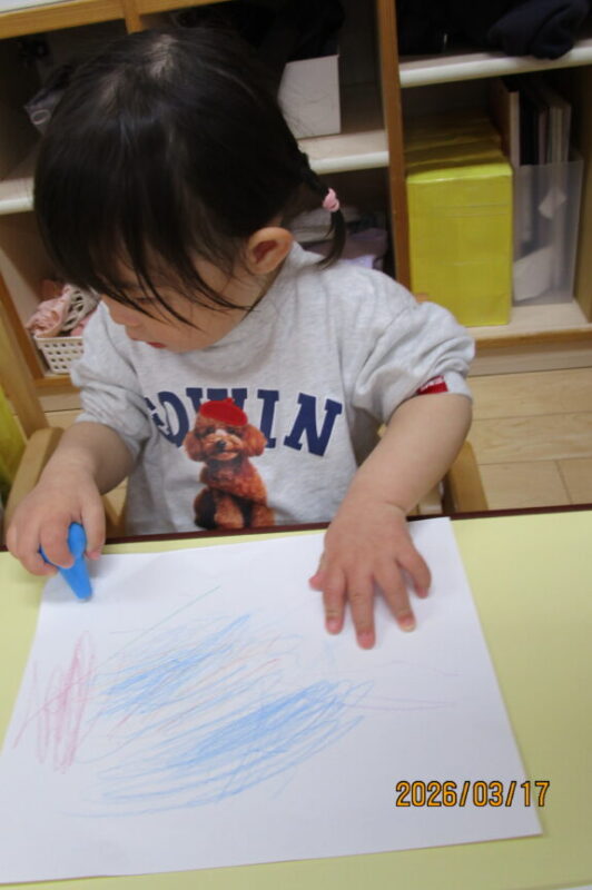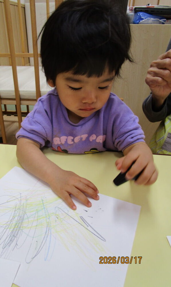 クレヨンを手に取ると、さっそくお絵描きを始めました。