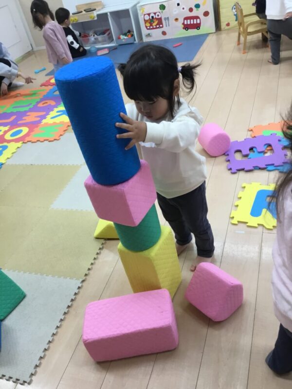 大型の布製積み木でも遊び、バランスをとりながら高く積み上げて楽しんでいます。