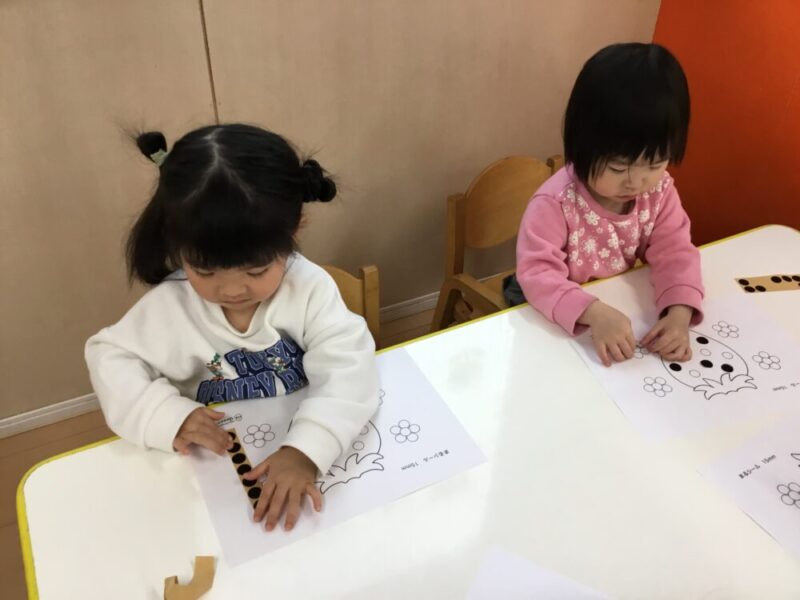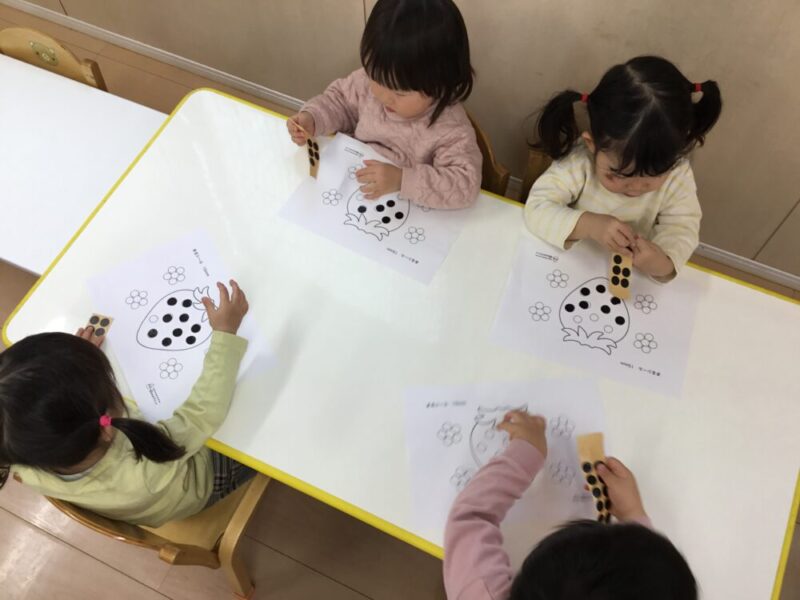 別日には、シール貼りの台紙を用意すると、丸印のところに上手に貼ってイチゴを完成させていました。めくって、貼る、といった動作もスムーズになり夢中でシールを貼って楽しんでいましたよ。