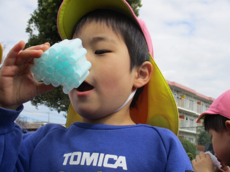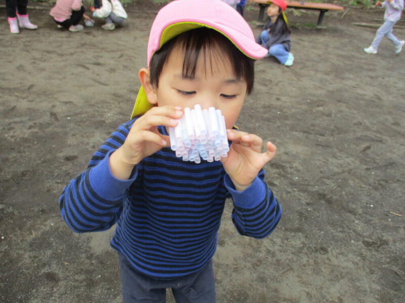 近くの公園に行って手作りのストローで吹いてみたら、たくさんシャボン玉がでてきた。