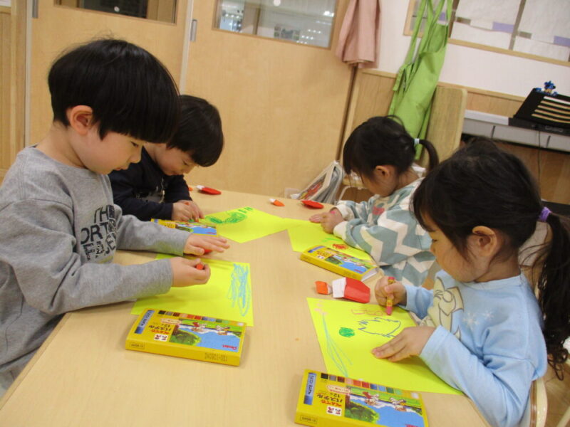 クレヨンで花や葉っぱを描いたら、てんとう虫が止まってくれそうなので、いっぱい描いてみた。