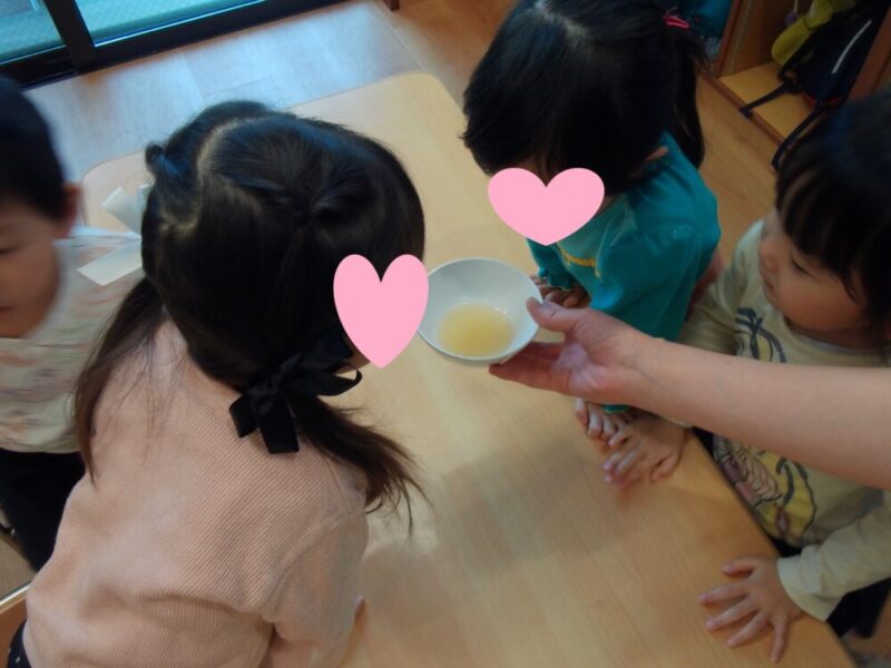 それは何だろう…?すみれ組のお友だちは、「お水?」「りんごジュースかな?」とお皿の中身を不思議そうに覗いていました👀