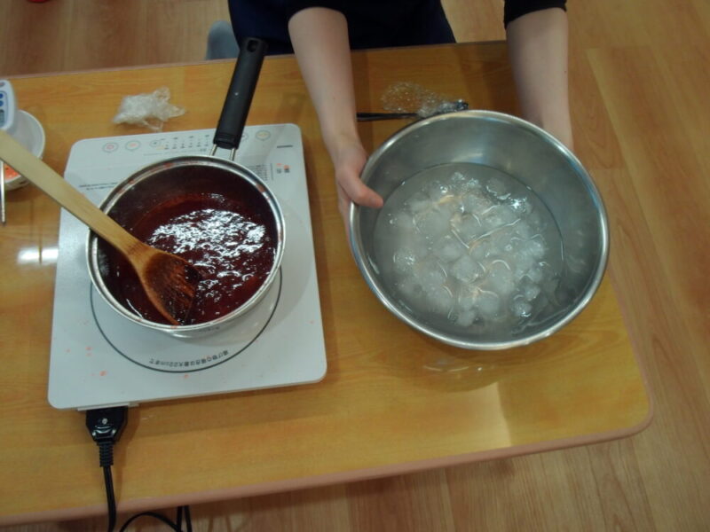 アツアツのいちごジャムを氷水に入れ冷やして完成です!