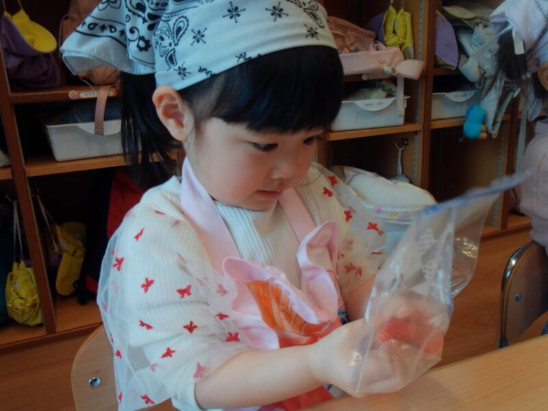 「ボールの中に入っているのは何だ?」の問いかけに「いちご!」とすぐに分かっていたすみれ組のお友だち。