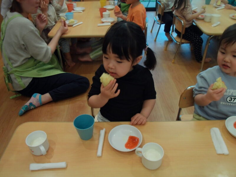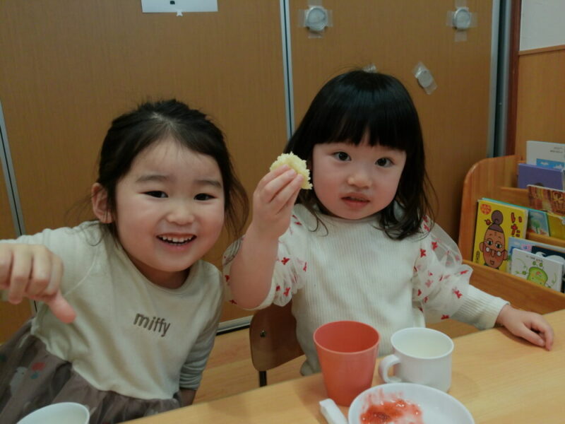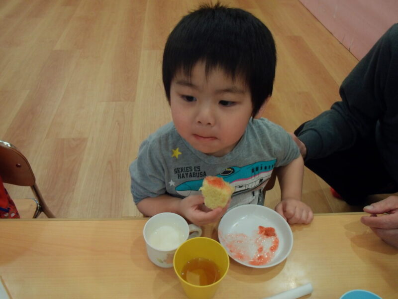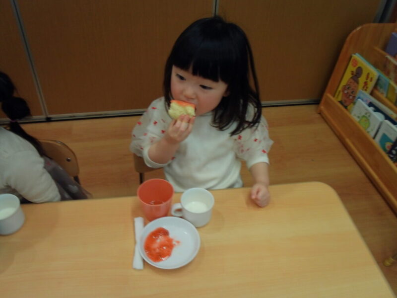 蒸しパンにいちごジャムをつけたり、ジャムを指で掬って食べてみたりと「美味しい~!」「あま~い!」と嬉しそうに食べていました😊