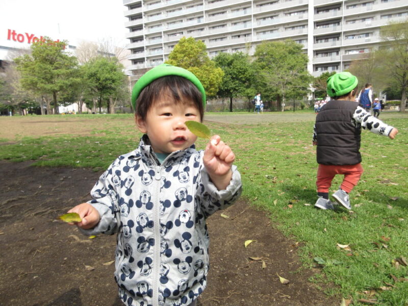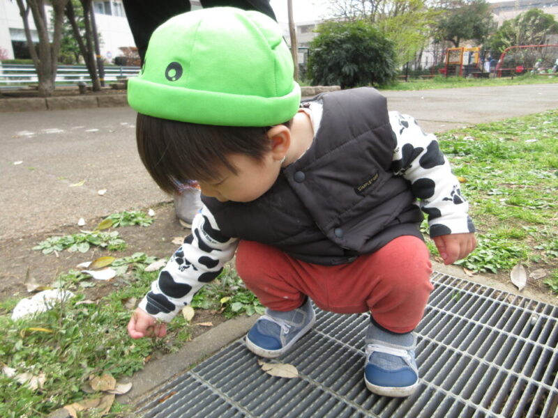 落ち葉や大きな花びらを見つけると拾って観察したり握ってみたりしていました。
