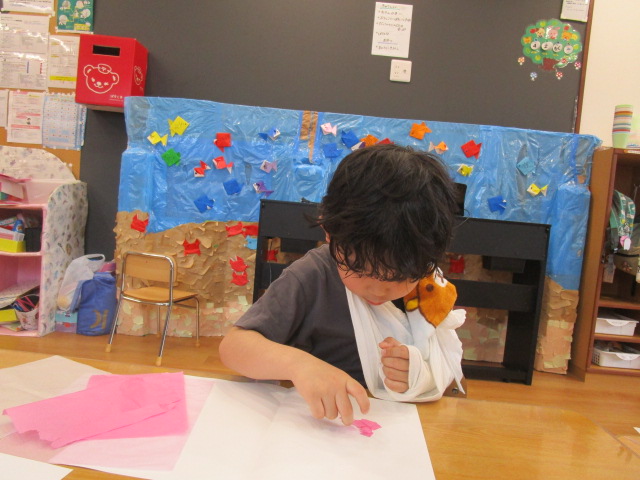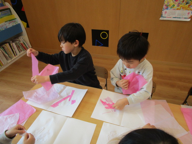 魔法の水で濡らした画用紙に花紙を貼り付けています!