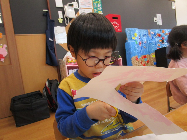 そして次の日、乾いた花紙を取り、色が付いた画用紙をチューリップの形に切りました✄