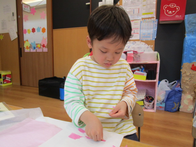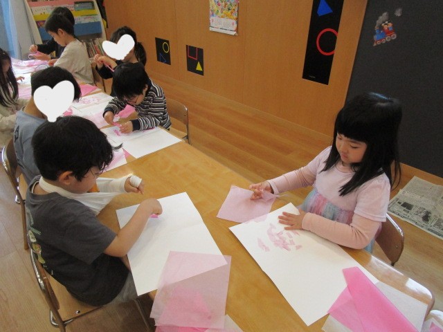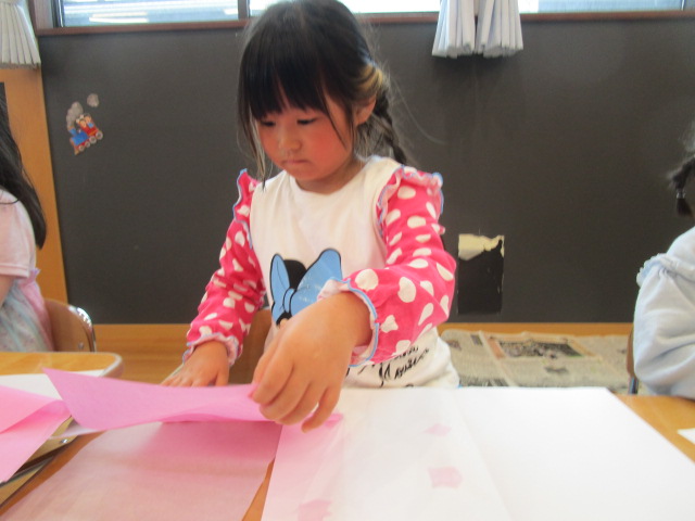 魔法の水で濡らした画用紙に花紙を貼り付けています!