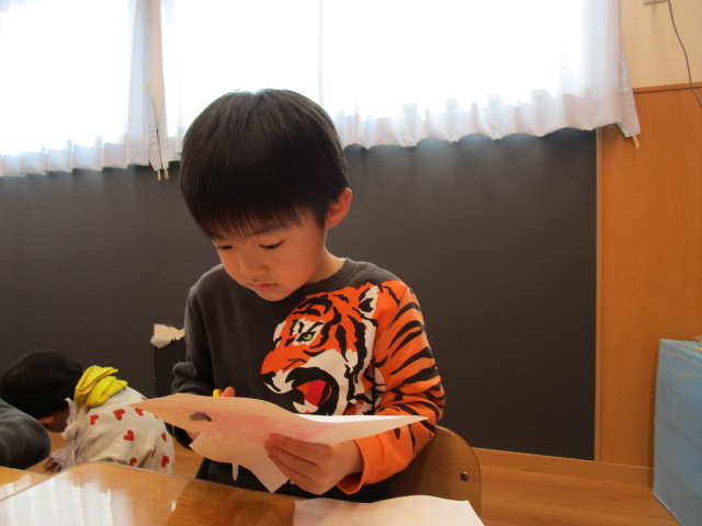 そして次の日、乾いた花紙を取り、色が付いた画用紙をチューリップの形に切りました✄